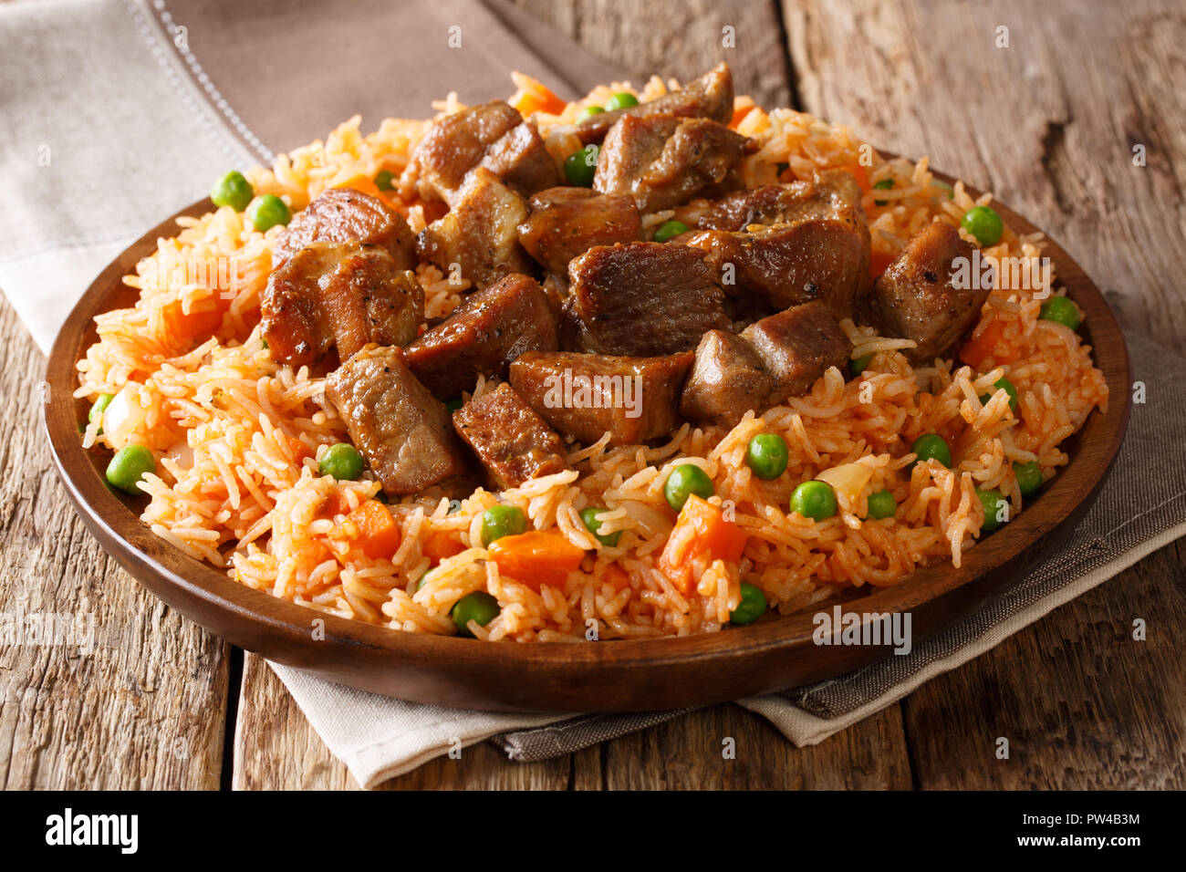 Authentische Rezept Der Wurzige Mexikanische Reis Gekocht Mit Tomaten Grune Erbsen Und Karotten Gebratene Schweinefleisch Nahaufnahme Auf Dem Tisch Serviert Horizontale Stockfotografie Alamy Rezept Mit Fleischwurst Und Paprika
