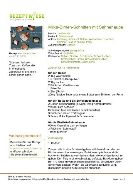 Milka Birnen Schnitten Mit Sahnehaube Rezeptwiese Gulasch Rezept Klassisch Rind