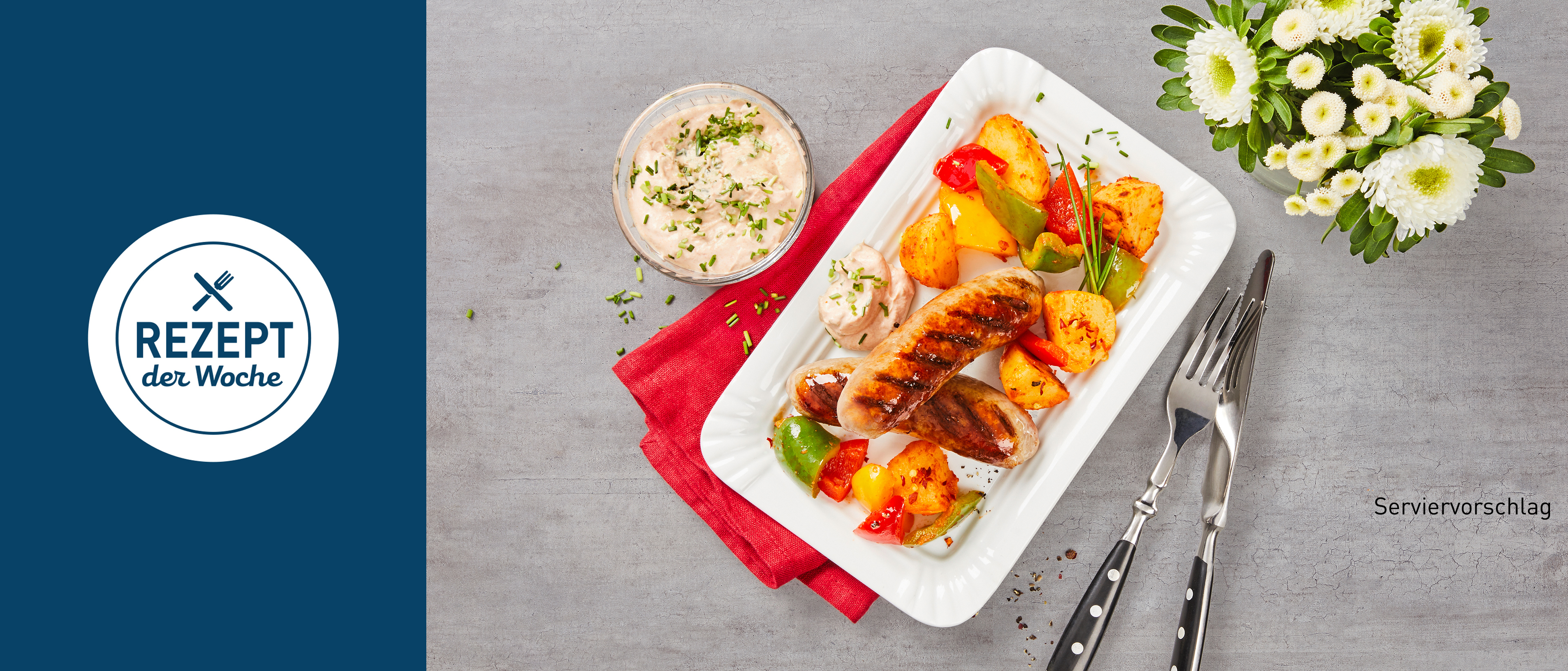 Bratwurst Mit Peperonata Kartoffeln Vom Grill Rezepte Von Aldi Nord Butternut Kuerbis Rezept Suppe