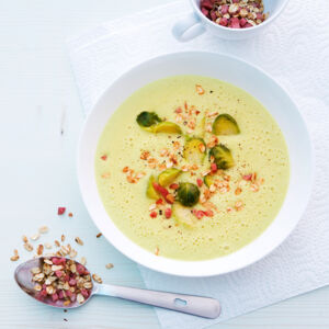 Die milch mit der butter erwaermen. Zwiebel und sellerie schaelen. Zuletzt den rosenkohl dazugeben und alles mit salz pfeffer und majoran wuerzen.