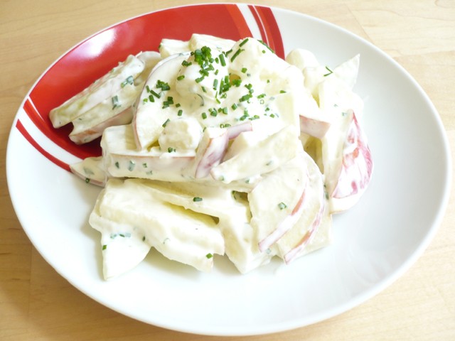 Den saft der zitrone mayonnaise creme fraiche und gehackten schnittlauch in einer kleinen schuessel vermengen und mit zucker salz und pfeffer abschmecken. 2aepfel schaelen kerngehaeuse entfernen und in stuecke schneiden. Alles zusammen mit den 20 min.